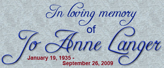 Jo Anne Grantham Langer was born in Eustis, Florida on January 19, 1935. She married Gene Langer on April 18, 1953 and had 3 children: Fred, Pam, and Eric. In the slide show below you will see she has always been beautiful and could have been a model at any point. She and Gene finally did do modeling in her late sixties. Jo Anne has loved to cook, sew, decoupage, and especially read. In the last several years her declining health prevented her from these activities. Accepting Christ as her savior as a young girl, she held to the assurance that she would be with Jesus upon her death. She recently sopke of her readiness to be with the Lord. We miss her tremendously, yet rejoice in the fact that she no longer suffers and is with her Lord. The memorial service was held: Saturday, October 3, 2009 at 9:30 AM In lieu of flowers, please send donations to the Thank all of you for you condolences and prayers. Gene, Fred, Pam, Eric and families |